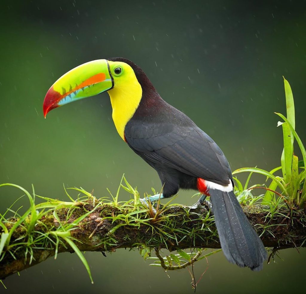 In the misty canopy of a Central American rainforest, a strange yet enchanting figure appears. A large bird hops among the branches, its body cloaked in black, its chest glowing lemon-yellow, and its oversized bill painted in wild strokes of green, orange, blue, and crimson. This is the Keel-billed Toucan (Ramphastos sulfuratus), one of nature’s most flamboyant creations and a true symbol of the tropics.