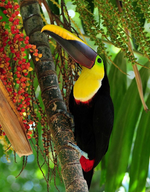 The most striking feature of this toucan is, of course, its bill—a brilliant rainbow arc that can reach nearly 20 centimeters long. Despite its size, the bill is lightweight, made of spongy keratin supported by thin bone. It serves many purposes: reaching fruit, tossing food into the air, intimidating rivals, and even helping regulate body temperature. The rest of the bird is no less dramatic: its body cloaked in glossy black, throat and breast glowing yellow with a splash of red at the base, and tail tipped in white. Both males and females share this vibrant attire, with only slight differences in size.